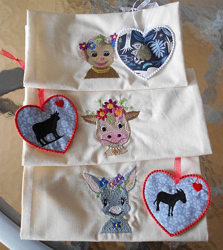 | Experiment3: Fransen mit 2 einzelnen Herzen im Satinstich | Tier-Motive auf den Herzen |