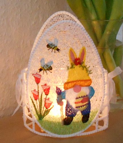 | "Österliches" Windlicht mit dem Gnom mit Hasenmütze | Die Rückseite - lauter Eier |