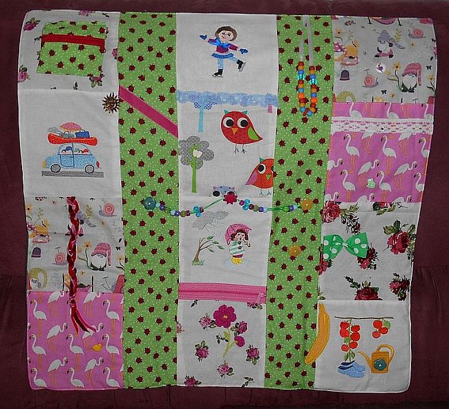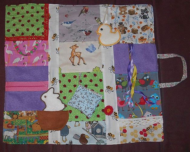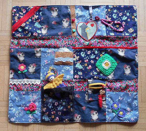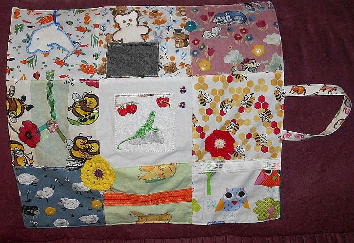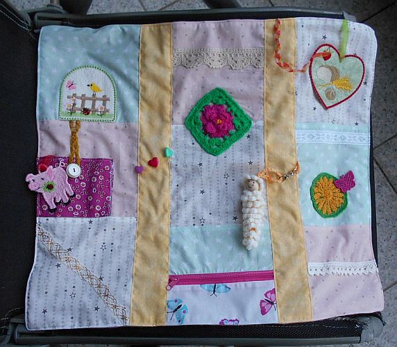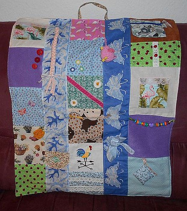 | Eine "dunkelbunte" Nesteldecke - unten sind 2 große Taschen, für ein Mini-Muckele und ein gesticktes Herz. | Und eine zweite - auch hier ist wieder ein Mini-Muckele dabei, versteckt hinter einer Fliegengitter-Tasche. Durch die Karabinerhaken kann man auch Positionen von den Anhängseln verändern. |