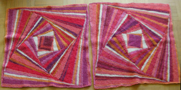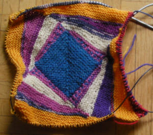 | Jetzt ist es fast geschafft - das letzte Patch und die eine Seite der Umrandung fertigstellen. Da ich durch das Kraus-Rechts ganz glatte Patches habe, muss ich keinen weiteren Rand drumrum stricken - nur eine Abkettreihe darüber. | Das