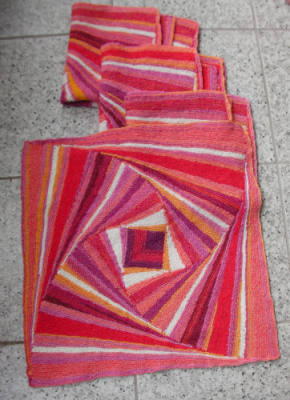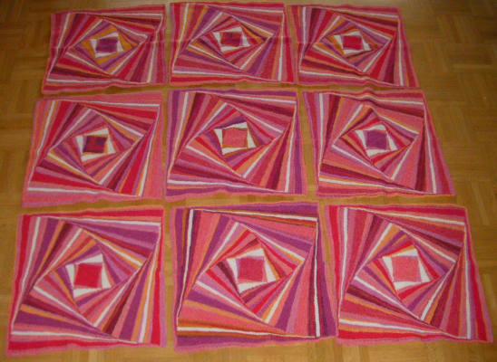 Langsam, aber stetig geht es weiter - Nr. 4 ist fertig. Dier Anordnung lasse ich bis zum Schluss offen, deshalb wird auch noch nichts aneinander gestrickt. | |