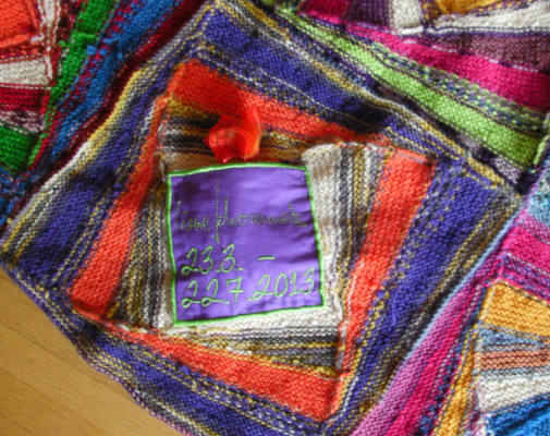 Auf der Rückseite - am Fußende - gibt es eine kleine Besonderheit: ich habe mir eine Applikation erstellt mit eigener Unterschrift und den Daten der Strickerei. Die habe ich per Hand aufgenäht und oben offen gelassen. Da ist nun ein Beutelchen mit Lavendel drinnen. Da ich "in den Bäumen" wohne, flattern auch manchmal so kleine "Beißerchen" durch das Gelände und haben evtl. Appetit auf Strumpfwolle, wer weiß das schon .... aber Lavendel mögen sie nicht. Es ist vorne das 2. Patch (auch lila) von links im oberen Bild. | |