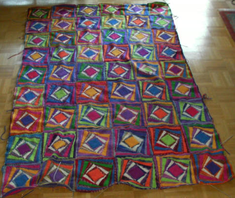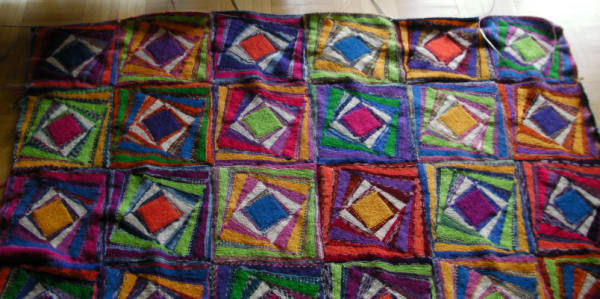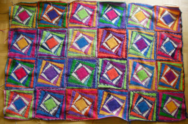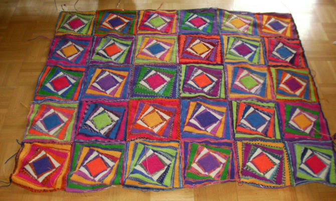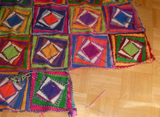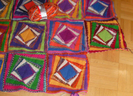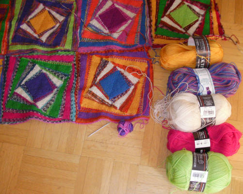 Wieder etwas geschafft. Aber es sind immer noch 3 Reihen à 6 Patches zu stricken. Man glaubt gar nicht, wie lang so ein Bett ist :) | |