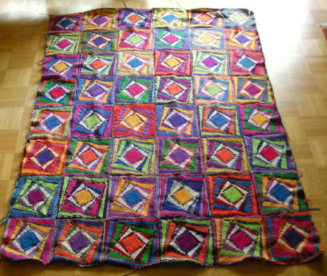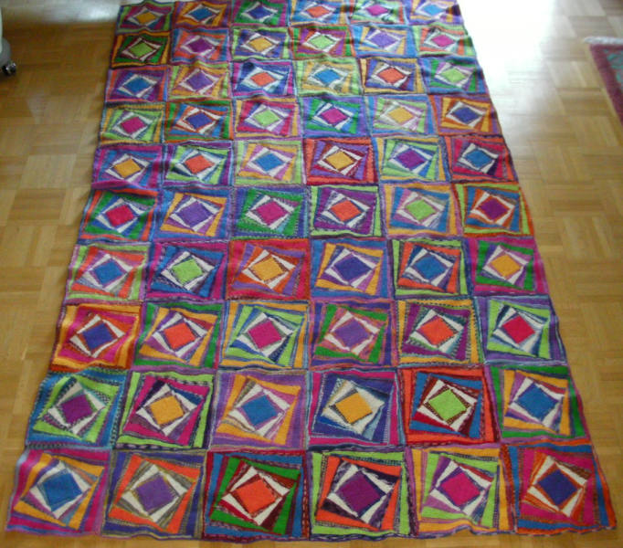nächsten Tag fertig machen. Das ist sie nun in voller Größe: ungewaschen ca. 2,35/2,40m x 1,35/1,40m. Nach dem Waschen wird sie die ganz richtige Größe haben. Es stecken tatsächlich 1875g Sockenwolle drinnen. |
