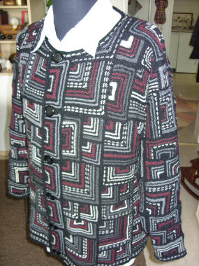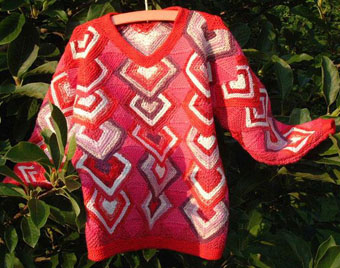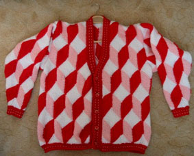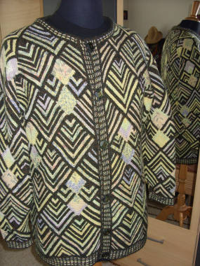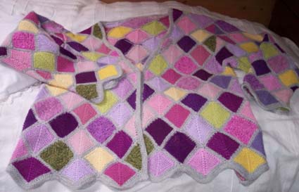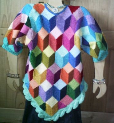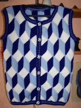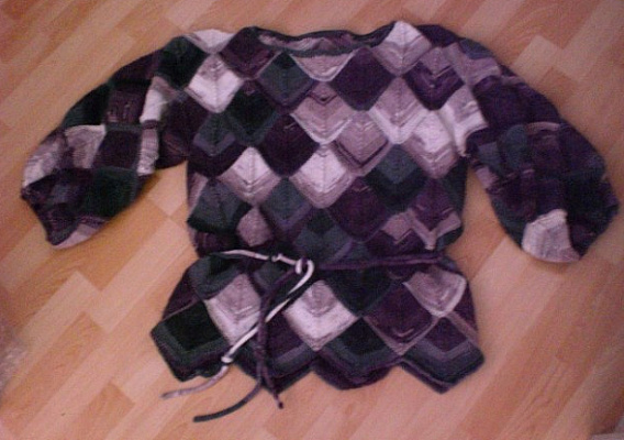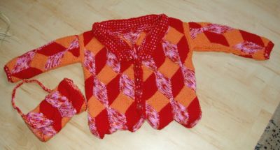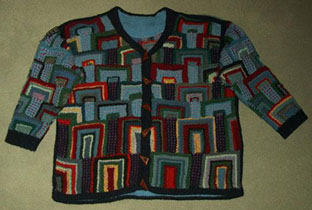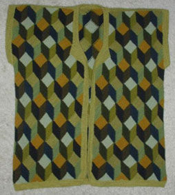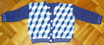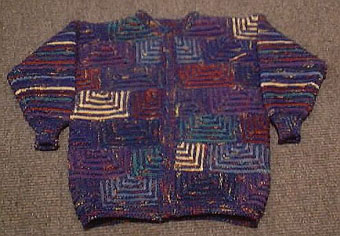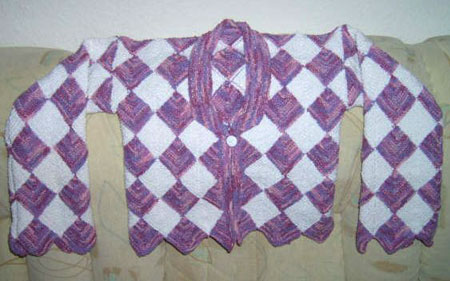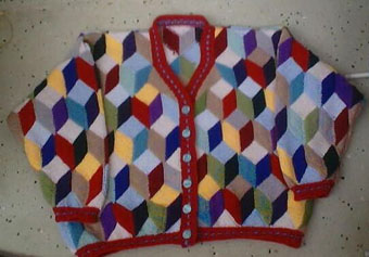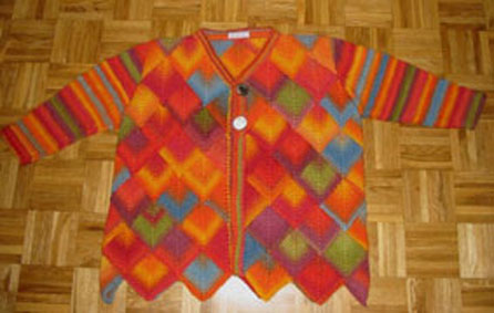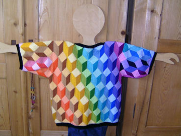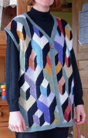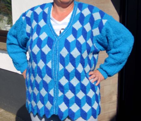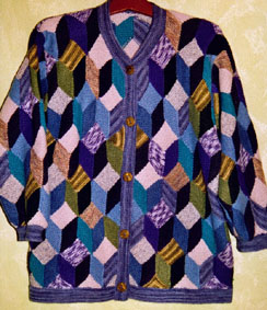 | Die Jacke hat DORLE gestrickt - sie hat erst im Mai 2001 mit dem Patchworkstricken begonnen - und das Modell ist sehr gelungen! | Diese Variante der Tumbling Blocks - Türme genannt - stammt auch von Dorle, die inzwischen ganz fasziniert vom Patchworkstricken ist. | |