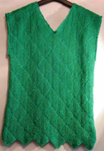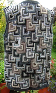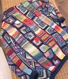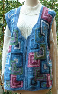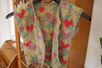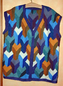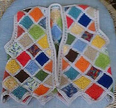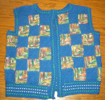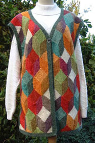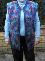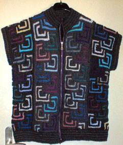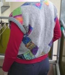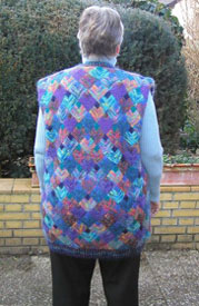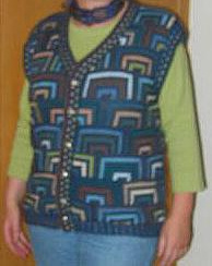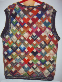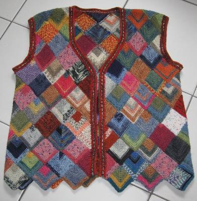 | Ist diese Decke, die wie ein Mosaik wirkt, nicht wunderschön? Kombiniert aus großen und kleinen Patches und dem "Stairway"-Muster. Das 1. PW-Strickwerk von Hannelore, aber nicht das letzte. | Und hier ist auch schon das nächste Werk - eine tolle Weste, die wirklich nicht nach Resteverwertung aussieht. | |