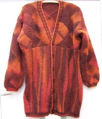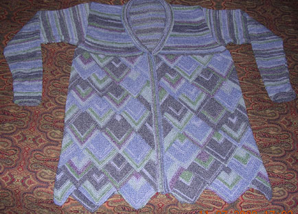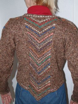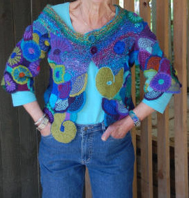 | Hier hat Bettina verschiedene Techniken in einer tollen Jacke vereint | Topflappen in versch. "Schenkellängen" und Streifen - und alles mit Effektgarnen - wunderschön | |