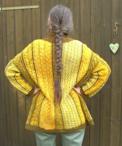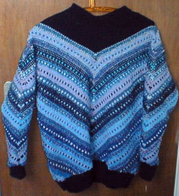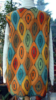 | Gaby hat diesmal "komponieren" lassen - nämlich die gefärbte und gesponnene Wolle (von Welli) -- sind die Farben nicht traumhaft schön? ... | ... aber gestrickt hat Gaby selbst -- ein extravagantes Rückenteil ziert diese Weste |