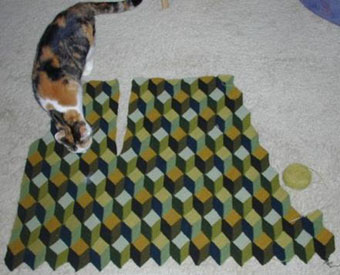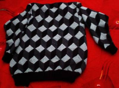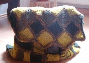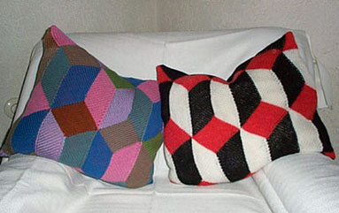 | Diese Kissen sind auch Tumbling Blocks - allerdings mit der Maschine gestrickt. Eine ausführliche Anleitung für diese Technik finden Maschinenstrickerinnen bei SABINE http://de.geocities.com/klingersabine/ |