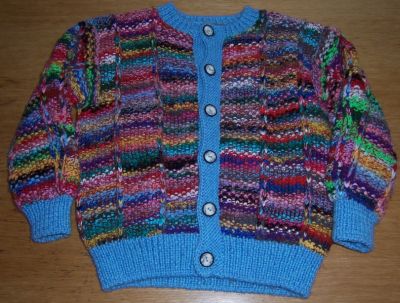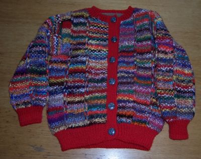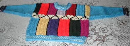 | Frau Sch. fand die Buntstifte schön und hat daraus eine Jacke gestrickt --- sie ist sehr gut gelungen! |
