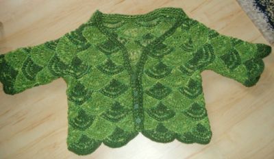 Gerdi hat Muscheln mit Hebe-Maschen zu einer wunderschönen Kinder-Jacke verarbeitet -- es sieht aus wie Tiffany - Glas |