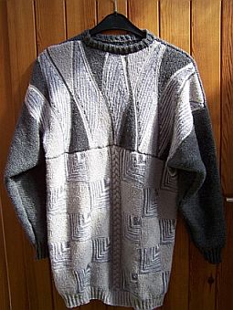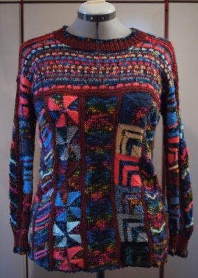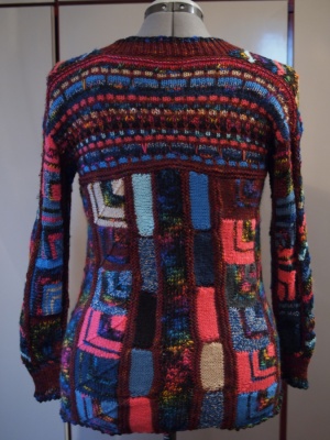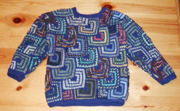 | Auch Margrit hat sich Ihren ersten Winterpullover in Patchwork-Stricktechnik ernadelt. |