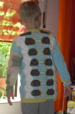 Carmens Enkel zum 2. Geburtstag. Die Ärmel sind bordeauxrot, der Rücken ist dunkelblau, den Rest sieht man ja. |