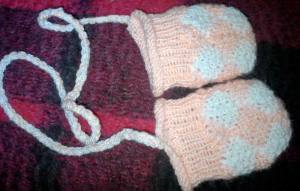 | Eine ganz goldige Baby-Garnitur in apricot - so wirkungsvoll können ganz einfache Patches sein | Noch ein Paar Winzlings-Handschuhe dazu |