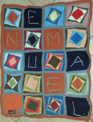 | Die Strickerin ist Katrin - und der Empfänger der Kuscheldecke braucht keine Angst vor Vertauschen zu haben. |