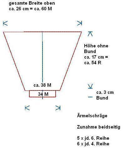 Die Schrägen wie angegeben stricken. Die Ärmel kann man gut von oben nach unten stricken, wenn Seitennähte vorhanden sind. Der Overall ist zwar geschlossen, aber gehen würde es, wenn es einem nicht zu fummelig ist. Falls aber nun von oben nach unten gestrickt wird, sind die hier angegebenen Zunahmen jedoch Abnahmen, die Reihenfolge dann bitte auch ändern in 6 x jd. 4. Reihe und 5 x jd. 6.Reihe. Und in der ersten Bündchenreihe dann um die 4 Maschen reduzieren, die das Bündchen weniger hat. |