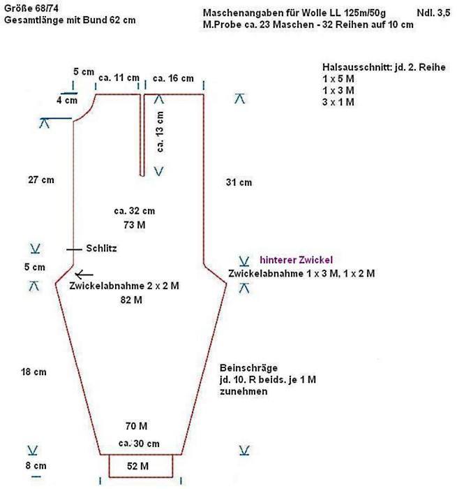 Maschenzahl zunehmen. (Hier sind es 70 M). Für die Beinschräge beidseitig Maschen zunehmen wie angegeben, dann sind es vor der Zwickelabnahme 82 Maschen. Die Zwickelabnahmen wie angegeben vornehmen - beim 2. Hosenbein natürlich gegengleich, d.h. auf der "rechten" Seite werden 2 x 2 M abgenommen und auf der "linken" Seite 1 x 3 und 1 x 2 Maschen. Diese Abnahmen erfolgen immer alle 2 Reihen. Nach dem Zwickel werden alle Maschen auf eine Nadel genommen, und zwar so, dass beide hinteren Zwickel aneinander liegen. Da wird der Rücken gestrickt. Ein paar Runden wird rund gestrickt. Die Maschenzahl ist natürlich die doppelte als im Schema steht, da nun beide Teile auf der Nadel sind. 5 cm nach dem Beginn des Zwickels wird die Arbeit geteilt (Schlitz) und offen in Hin-und Rückreihen gestrickt. Dort endet später die Knopfleiste. 13 cm vor Ende der Gesamthöhe kommt das Armloch. Dort teilt man die Arbeit. Möchte man einen kleinen Halsausschnitt im Rückenteil machen, strickt man am besten erst die Vorderteile fertig, dann hat man die Maschen für den Rücken bzw. die Schultern und kann über die letzten 4 Reihen einen Halsausschnitt arbeiten. 4 cm vor Ende kommt der Halsausschniit. Dafür an jeder Vorderseite jd. 2 Reihe die angegebenen Maschen abketten und die restl. 6-7 Reihen ohne Abnahmen gerade hoch stricken. |