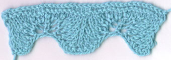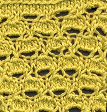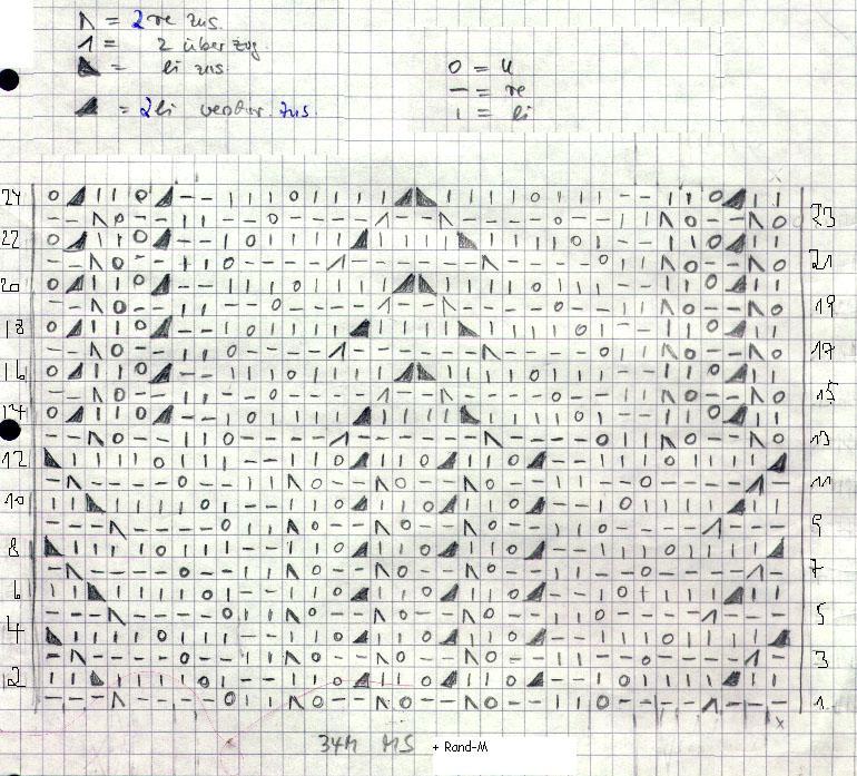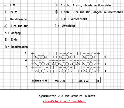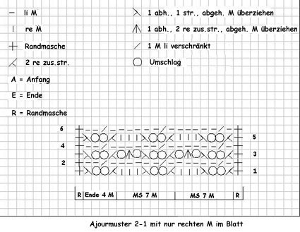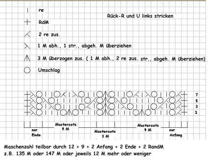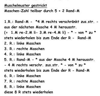 Zahl teilbar durch 18 + 2 Rand-M 1. R.: Rand-M - * 3x 2 M re zus.str. - 6 x 1U/1 M re - 3 x 2 M re zus.str. * - von * zu * bis zum Reihen-Ende wiederholen - Rand-M 2. R.: alle M und U links stricken 3. R.: re M 4. R.: re M diese 4 R ständig wiederholen |