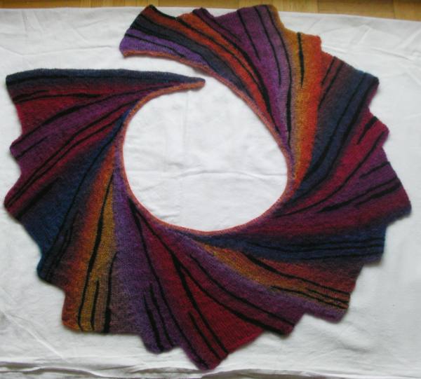 Das ist das gleiche Material wie der erste Schal - aber diesmal mit unregelmäßigen Kurzreihen aus schwarzer Wolle. Auch in Krausrippen. Durch die zusätzliche Wolle habe ich den Schal bis zum Ende gestrickt und einen sehr langen "Pelerinen"-Schal bekommen - gut auf einem Mantel zu tragen. |
