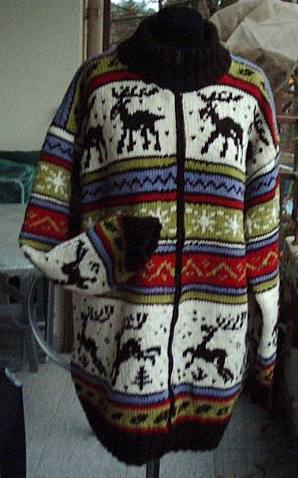 Die untere Rentierbordüre habe ich aus einem uralten Tchibobuch teilweise entliehen, die obere mußte ich dann selbst zeichnen und gestalten (mit meinem Kreuzstichprogramm geht das super), da sie nicht so hoch sein durfte und ich auch "gezähmte" Rentiere haben wollte. Die Jacke ist aus sehr dicker Merinowolle, hat einen Reißverschluß und einen Troyerkragen. Und sie ist sooo molligwarm. |