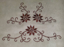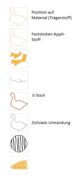 normalerweise aus 3-4 Kontur-Schichten. 1. Die Position auf dem Trägerstoff - da soll die Appli hingestickt werden. 2. Das Feststicken der Applikation. Danach können Muster auf den Applistoff gestickt werden. 3. Nun kommt eine E-Kontur. Die sieht aus wie ein E, fortlaufend gestickt und diese Kontur befestigt den Rand sehr sauber, so dass beim nun folgenden Schnitt des Applistoffes die Kontur, falls sie angeschnitten wird, sich nicht auflöst. Diese Linie ist optional, wird auch nicht von allen sogenannten Applikations-Assistenten angeboten, kann aber jederzeit von Hand dazu gelegt werden. Ich habe sie farbig markiert, damit man das Schneiden nicht vergisst - ansonsten wird sie natürlich in der Umrandungsfarbe gestickt. Also: nun den Stoff knappkantig wegschneiden!! 4. Das ist dann die Zickzack-Umrandung, die alles sauber übersticken sollte, und danach sollten auch möglichst keine Fransen herausstehen. Der Trick ist: alle Konturen von 1-3 sollten um 2 % verkleinert werden. Die Zickzack-Umrandung bleibt in Originalgröße. So werden die andere Konturen nach innen zum Stoff gelegt und gestickt und nicht nach außen zu den äußeren Stichpunkten der ZZ-Umrandung. Kleine Fransen, selbst bei sehr fransigen Stoffen, kann man u.U. vorher wegschneiden oder sie werden direkt mit eingestickt. Bei mir gibt es meistens eine weitere Option: auf die ZZ-Umrandung kommt oft noch ein Zierstich. |