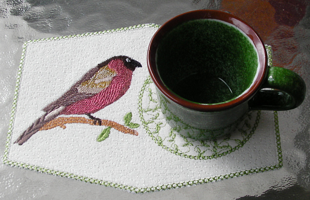Applikation mit einem Dampfbügeleisen behandelt. Diese Mug Rugs haben einen Unterstoff. Bei den Mustern ist immer eine "Gebrauchsanweisung" dabei, weil es ein bissel mehr Stoff als bei den "normalen" Applikationen ist. Die Grundlage ist aber dieselbe. |