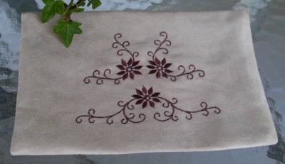 | Dieses Teil von einem Windlicht ist nun getrocknet und gebügelt, dabei habe ich beim Bügeln die eine Seite etwas angehoben. So erhält diese Seite des Windlichts schon die halbrunde Form, die man aber auch mit einem Glas erreicht, wenn man das Windlicht fertig geschnürt hat. | Ein fertiges Windlicht, bestickt mit einer Clematis-Blüte | |