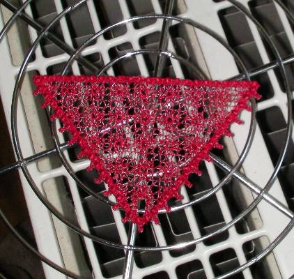 Trocknen - im Sommer in die Sonne. Hier sieht das Gitter sehr breitreihig aus - aber das ist es nicht - nur ist die rote Spitzen-Ecke recht klein, das täuscht ein wenig. Die Lace-Stickerei rutscht also nicht durch die Rillen. Anschließend bügele ich die trockene Stickerei kopfüber auf einem Frotteetuch liegend, dass die Stickerei nicht "platt" wird. |