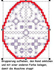 Filigran - Ei 1 wird im L&E ( PE Design von brother) bearbeitet: wenn die Gruppierung aufgehoben ist, kann man den Rand mit einer anderen Farbe belegen, damit die Maschine vor Beginn der Umrandung stoppt, um die andere Hälfte des Eis auf die Unterseite zu kleben und dann beide Hälften mit dem Umrandungsstich zu fixieren. |