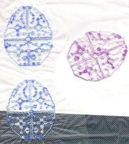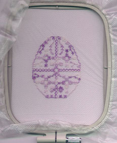 | Im großen Rahmen habe ich gleichzeitig 3 Eiformen sticken lassen,man kann auch verschiedene zusammen legen. Das lilafarbene Ei ist schon ausgeschnitten. Im etwas kleineren Rahmen habe ich dann die Eiform gestickt, die die Umrandung bekommt. Da die Kontur ja mit einer anderen Farbe belegt ist, hält die Maschine nach der Eiform an, man nimmt den Rahmen aus dem Halter aber nicht das Gestickte, klebt mit einem Kurzzeitkleber - z.B. KK 100 von Gunold GmbH - die ausgeschnittene Eiform auf die Rückseite der im Rahmen befindlichen Stickerei, hängt das Ganze wieder in die Maschine und läßt nun die Umrandung sticken. Bei diesem ombré - Garn muß man keinen anderen Unterfaden benutzen, da sich der sehr gut farblich mit dem ombré - Garn verbindet. | |