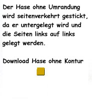 | Bei dem Hasen muß ein Teil spiegelverkehrt gestickt werden - für Hase 3 gibt es hier den Download. Einmal gespiegelt ohne Kontur und einmal "normale" Richtung mit farblich abgesetzter Kontur, damit die Maschine nach der Körperform anhält und man den Hasen unter den anderen kleben kann. | |