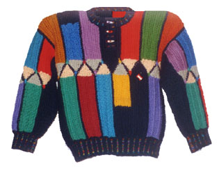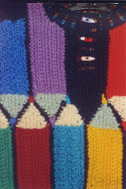 Das vergrößerte Bild des Buntstifte-Pullis sowie ein Detail-Foto. Die Spitzen der Stifte sind nachträglich aufgestickt. Als Schließen wurden kleine Buntstift-Knöpfe gewählt. Auf der unifarbenen Fläche sitzt ein kl. Anspitzer.